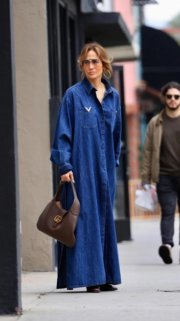Одним выходом Дженнифер Лопес решила повторить сразу несколько модных трендов сезона. В первую очередь, это деним, которого должно стать в вашем гардеробе больше в несколько раз. Звезда выбрала джинсовое платье-рубашку длины макси свободного кроя. И еще один тренд, который нас не покидает несколько лет, — головокружительные разрезы от бедра, что видны у Джей Ло вовремя ходьбы. К эффектному луку она подобрала актуальные сапоги-трубы, сумку в винтажном стиле, очки и крупные серьги-кольца.