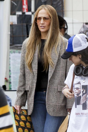 Если вы привыкли видеть Дженнифер Лопес в шикарных платьях и на высоких каблуках, спешим заверить, что знаменитости тоже любят удобство и комфорт. Для прогулок по магазинам певица выбрала классические джинсы-трубы со слегка заниженной талией и дополнила образ клетчатым пиджаком свободного кроя. Под спокойную палитру она подобрала базовый черный лонгслив и сумку со змеиным принтом. Очки-авиаторы стали модным акцентом кэжуал аутфита.