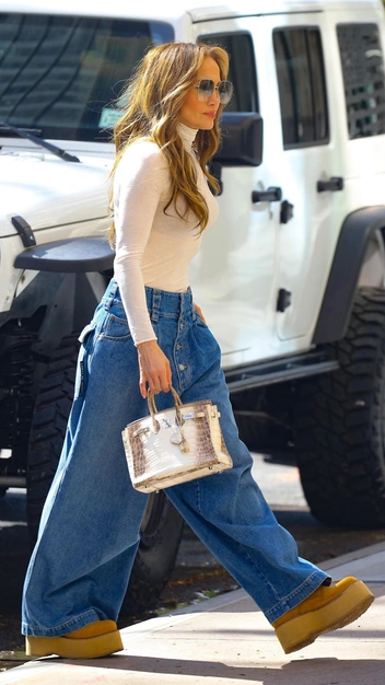 Не знаем, сколько джинсов в коллекции Дженнифер Лопес, но каждый раз она удивляет нас новой моделью. Недавно знаменитость была замечена в ультрамодной паре: певица надела джинсы на высокой посадке с защипами, накладными карманами и пуговицами вместо молнии. Их она дополнила полупрозрачным лонгсливом, замшевыми ботинками на платформе, кожаной сумкой и крупными очками.