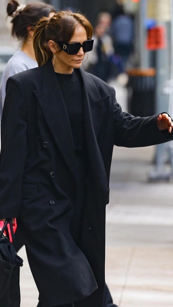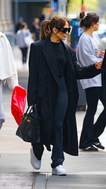 Знаменитость продолжает стилизовать в одном образе спорт и шик. Так, недавно Дженнифер Лопес была замечена в безупречном аутфите, который вы можете повторить. Она примерила укороченный джемпер из тонкого трикотажа и подобрала к нему расклешенные брюки с белоснежными кроссовками. Эффектности выходу придало бесподобное пальто прямого кроя с акцентными плечами. Завершили образ аксессуары: кожаная сумка и очки.