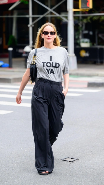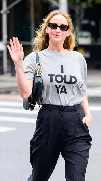 Дженнифер Лоуренс уверенными шагами покоряет молодое поколение и становится для него негласной иконой стиля. А этот недавний образ актрисы заставил всех обсуждать ее гардероб, и причина тому — футболка Loewe с надписью I Told Ya. За ней охотятся все модные девушки, потому что именно ее Джонатан Андерсон, креативный директор бренда, выпустил в честь премьеры фильма «Претенденты», над костюмами которого он работал. Там и появилась футболка как отсылка к гардеробу Джона Ф. Кеннеди-младшего.
