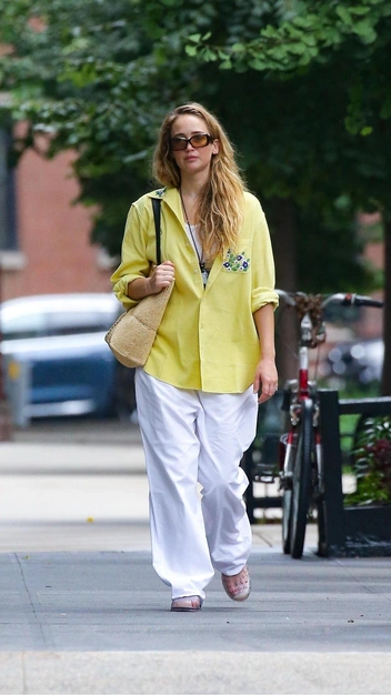 Нам нравится, как меняется стиль актрисы и как она интегрирует узкие модные тренды в свой гардероб. Так, в ее коллекции появилась самая нашумевшая обувь — прозрачные резиновые туфли, вернувшиеся к нам из нулевых. Их Дженнифер Лоуренс подобрала к расслабленному аутфиту: базовой майке-алкоголичке, свободной желтой рубашке и белоснежным широким брюкам. Завершили аутфит трендовые очки и плетеная сумка.