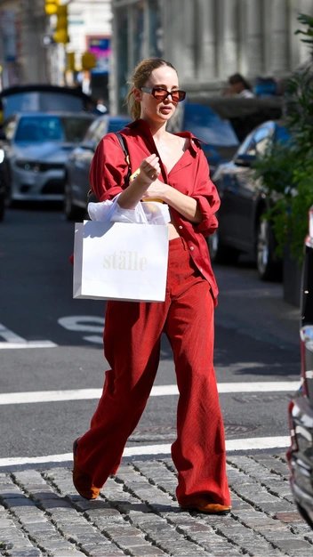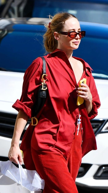 Недели моды в Нью-Йорке, Лондоне, Милане и Париже доказали, что красный — самый модный цвет осени и зимы 2024/25, который появится в гардеробе всех стильных девушек. Однако начать его носить можно уже сейчас, как делает Дженнифер Лоуренс. Звезда примерила эффектные брюки на средней посадке и дополнила их оверсайз рубашкой, которую она застегнула лишь на одну пуговицу. Завершили выход туфли, черная сумка и очки.