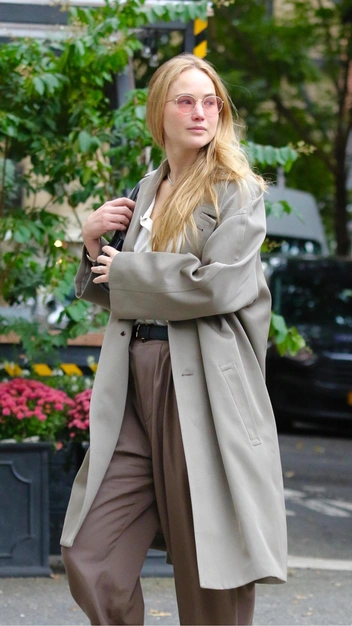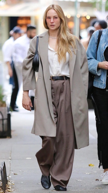 В новом выходе Дженнифер Лоуренс сделала акцент на пропорциях, за счет чего получила безупречный образ, который ее стройнит и делает выше. Для него она выбрала свободную белую блузу в молочном оттенке и коричневые брюки на высокой посадке, что эффектно подчеркивают талию и вытягивают фигуру. Модный лук голливудская звезда дополнила лаконичным плащом до колена, кожаными туфлями-тапочками и небольшой сумкой.