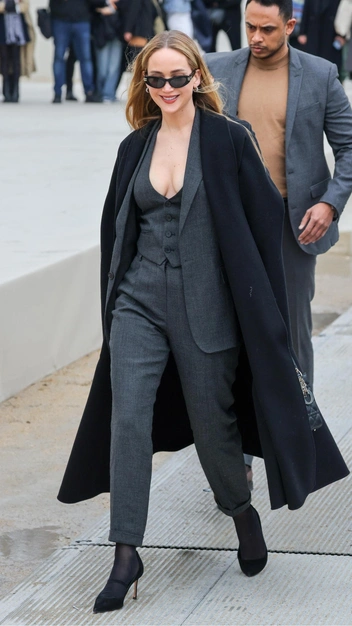 В последнее время Дженнифер Лоуренс радует нас стильными выходами, которые ей идут. Недавно она была замечена на Неделе моды в Париже, куда прибыла на показ Christian Dior. Звезда примерила сексуальный брючный костюм, который состоит из приталенного жилета с глубоким декольте, узких брюк и свободного пиджака. Поверх него она надела классическое черное пальто и завершила лук туфлями, сумкой и очками.