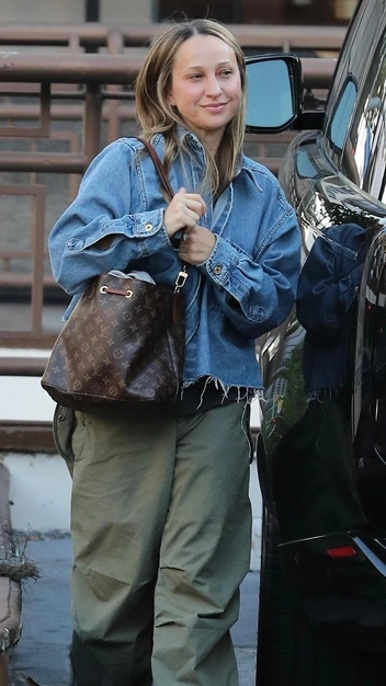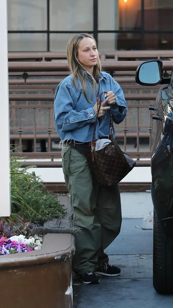 Модный дизайнер ювелирных украшений ненароком нам напоминает, что в тренде все еще оверсайз, и чем его больше — тем лучше. Именно под таким девизом Дженнифер Мейер стилизовала свой последний аутфит. Она надела свободную футболку, широкие брюки-парашюты в болотном оттенке и подобрала к ним эффектную джинсовую рубашку с необработанным краем. Небрежный мальчишеский лук она дополнила сумкой Louis Vuitton, что придала выходу роскоши.
