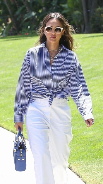 Нет ничего проще и стильнее, чем сочетание рубашки и брюк. Джессика Альба тоже подтверждает это суждение и показывает модный образ в духе old money. Знаменитость надела полосатую рубашку и завязала ее края в области талии, к ней она подобрала широкие белоснежные брюки на высокой посадке. Завершили лаконичный выход аксессуары: кеды на платформе, синяя сумка и очки.