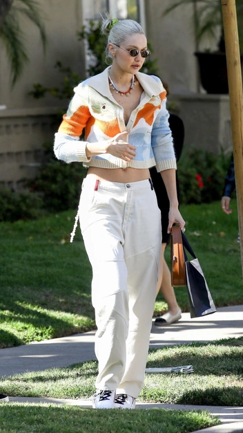 Джиджи Хадид окончательно вернулась в форму после родов. Модель уже успела поучаствовать в модных показах на Неделях моды в Милане и Париже, а теперь активно снимается для глянца и рекламных кампаний. В свободное время Джиджи как всегда старается носить удобные вещи: вы не увидите ее на каблуках или короткой юбке. Вместо этого звезда носит широкие брюки карго и модный укороченный кардиган с принтом, открывающий ее подтянутый пресс. Белые кроссовки и маленькие солнцезащитные очки завершили стильный повседневный аутфит знаменитости.