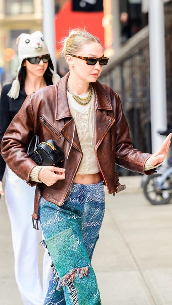 Сейчас стиль Джиджи Хадид постепенно меняется: от лаконичной и классической одежды она отходит в сторону безумных нулевых, выбирая необычные вещи. Ярким акцентом в ее новом образе стали синие джинсы с надписями и розовой бахромой. К ним она подобрала трикотажный джемпер укороченного кроя и винтажную кожаную куртку в коричневом оттенке с потертостями. Подчеркнули выход красные кроссовки, украшения, очки и маленькая сумка.