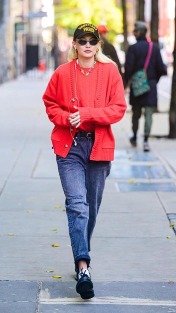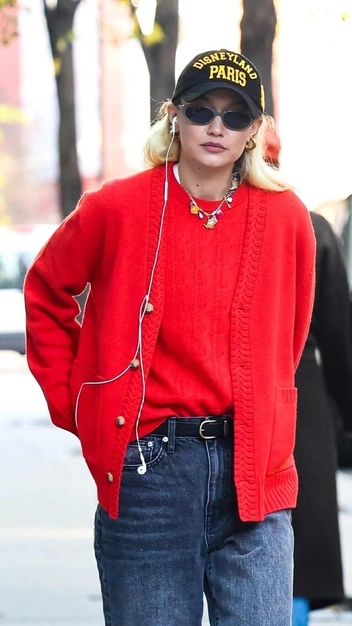 Топ-модель не боится ярких оттенков в гардеробе: в ее коллекции есть желтые, зеленые и оранжевые свитеры, на которые решатся не все девушки. В последнее время она выбирает для образов еще один модный цвет — красный, перед которым в осенне-зимнем сезоне 2023/24 невозможно устоять. Недавно Джиджи Хадид примерила вязаный джемпер поверх белой футболки и подобрала к нему в тон кардиган. На низ она надела синие джинсы на низкой посадке, которые отлично оттеняют акцентный верх.