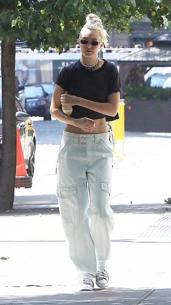 Джиджи Хадид окончательно вернулась в форму, которая у нее была до родов. Селебрити гордо демонстрирует результаты своих трудов, подчеркивая идеальный пресс джинсами с низкой посадкой. Модель с широкими штанинами и накладными карманами на манер карго Джиджи дополнила укороченной черной майкой и базовыми кедами.