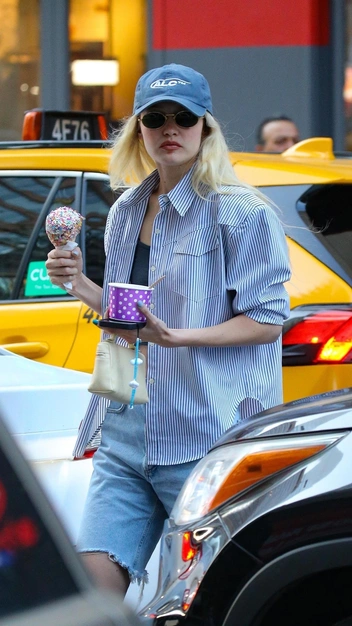 Супермодель встречает потепление в соответствующем луке. Джиджи Хадид надела удлиненные джинсовые шорты в духе 90-х, укороченный темно-синий топ и простую рубашку с акцентными плечами. Дополнила повседневный аутфит она винтажными кедами, микро-сумкой, кепкой и круглыми солнцезащитными очками. Модель на пару с подругой взяла самое сладкое мороженое в прилавке, села в кабриолет и поехала отдыхать — идеальный день, который стоит повторить каждой из нас.