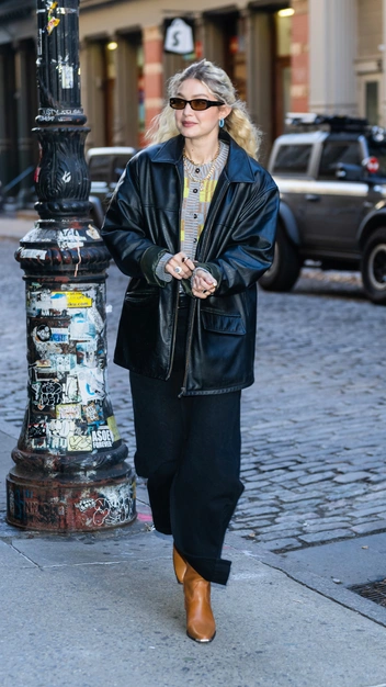 Джиджи Хадид появилась в безупречном аутфите на открытии поп-ап магазина своего бренда в Нью-Йорке. Многослойный образ можно рассматривать бесконечно: модель надела серую футболку, кашемировый кардиган и джинсовую юбку. Не смогла расстаться Джиджи и со своей любимой кожаной курткой в духе 90-х. Завершением образа стали модные сапоги-казаки, солнцезащитные очки и украшения: кольца-печатки, серьги и цепи.
