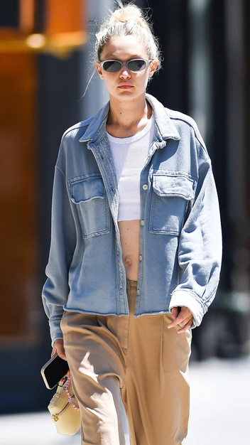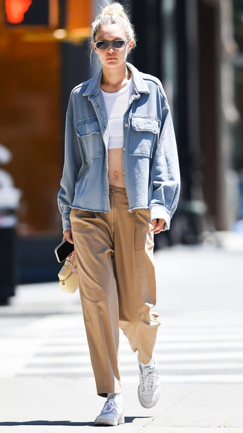 Брюки, юбки и джинсы с низкой посадкой официально вернулись в наш гардероб, однако не все готовы этот тренд принять. Во-первых, все, что мы видим с такими вещами — это смелые и часто совершенно неприменимые к жизни образы селебрити и модных инфлюенсеров. Во-вторых, многие действительно привыкли к комфорту высокой посадки и не готовы с ней расставаться. Но Джиджи Хадид уверена, что и в брюках с заниженной талией можно чувствовать себя на все 100. Так, американская модель сочетает брюки песочного оттенка с белым кроп-топом и джинсовой рубашкой свободного кроя. К наряду звезда подобрала белые кроссовки и солнцезащитные очки.