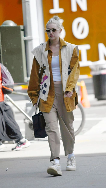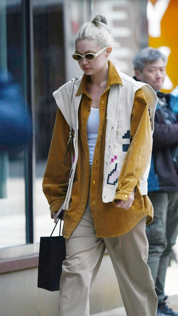 Мы привыкли видеть на модных инфлюенсерах отработанную схему сочетания вещей. Но у Джиджи Хадид есть несколько свежих идей, как разнообразить повседневный гардероб. Например, заменить привычные джинсы бежевыми брюками, добавить к ним вельветовую рубашку и жилет. Останется лишь дополнить образ кроссовками и парой солнцезащитных очков.