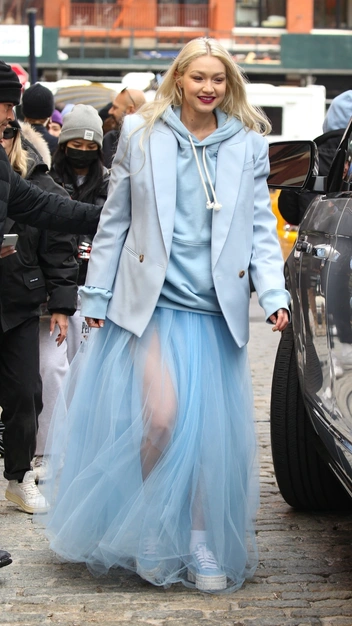 Джиджи Хадид вышла из декрета и с головой погрузилась в работу. Звезда удачно завершила еще один модный сезон, а теперь работает над новыми коммерческими проектами. Последние несколько дней селебрити снимается в новой рекламной кампании Maybelline. Образы для работы получились очень яркими и интересными. Например, монохромный голубой лук, напоминающий современную интерпретацию аутфита Кэрри Брэдшоу с пышной пачкой. Джиджи носит такую с худи и объемным жакетом.