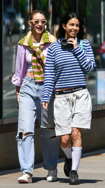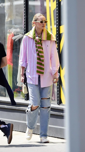 Выход Джиджи Хадид — настоящий заряд бодрости в эту пятницу. Она отправилась на прогулку с подругой в эффектном образе, который нам не терпится повторить. Модель надела белый топ и свободную розовую рубашку в полоску, у которой она небрежно подогнула рукава. На низ знаменитость примерила прямые джинсы с рваными коленками и классические кеды. Нравится нам, как Джиджи повязала на плечи свитер, — такая незаметная деталь, как кажется, и задала образу игривость и яркость. Завершила выход она аксессуарами: трендовыми очками с белой оправой и микро-сумкой.