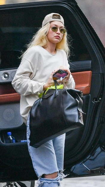 Предлагаем одним весенним утром повторить выход Джиджи Хадид — расслабленный аутфит, который выглядит стильно. Супермодель надела объемный свитшот в бежевом оттенке и модные голубые джинсы с рваными коленками. Завершили образ аксессуары: кепка, солнцезащитные очки с цветными стеклами, большая сумка и лоферы молочного оттенка.