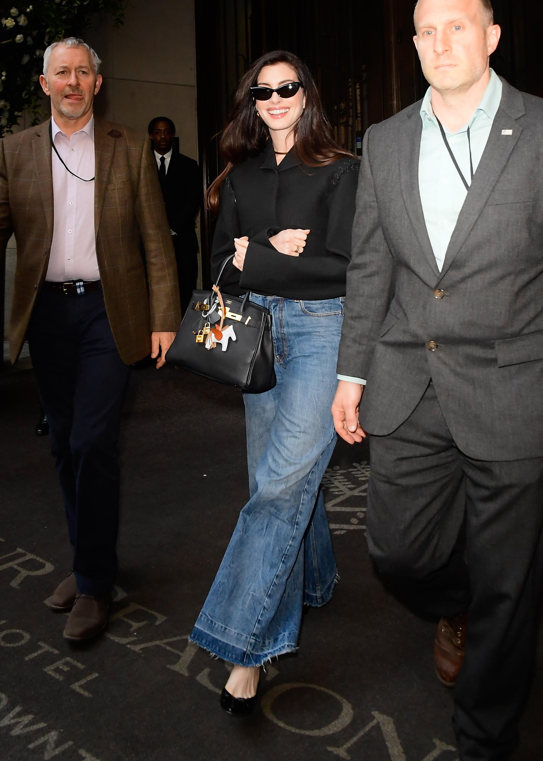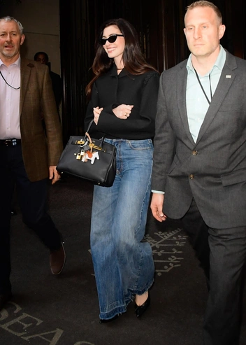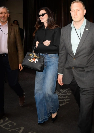Энн в очередной раз подтверждает, что формула «джинсы и жакет» никогда не подводит, если грамотно подобрать силуэты: актриса делает ставку на широкий винтажный деним и укороченный черный пиджак с четкой линией плеч, за счет чего образ получается одновременно расслабленным и собранным. Лаконичные балетки, солнечные очки и культовая Birkin в руке поднимают базовый комплект на уровень тихой роскоши — тот случай, когда можно выйти из отеля в простых джинсах, но выглядеть как главная героиня американского фильма.