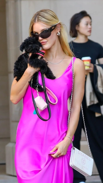 Знаменитость решила повторить недавний выход Амелии Виндзор и на один день перевоплотиться в куклу Барби. Она примерила яркое платье-комбинацию в оттенке фуксия и дополнила его минималистичными кожаными кроссовками в бело-сиреневом цвете. Гармонично в образ вписалась и белоснежная сумка Chanel на длинной цепочке со светло-розовой надписью Chanel. Женственный выход Джой Корриган балансирует ультрамодными очками и крупными серьгами.