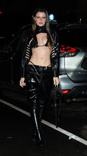 Один из самых первых публичных выходов Джулии Фокс в 2023 году повторил тренды прошлых сезонов. Знаменитость надела лакированные брюки на низкой талии, из-под которых виднеется нижнее белье, кожаный лиф и рукава с воротом, напоминающие часть куртки-мотоциклетки. Дополнила аутфит она остроносыми сапогами на шпильке и маленькой сумкой с шипами. Предана Джулия Фокс осталась и своему макияжу: седые волосы, высветленные брови и массивные стрелки.