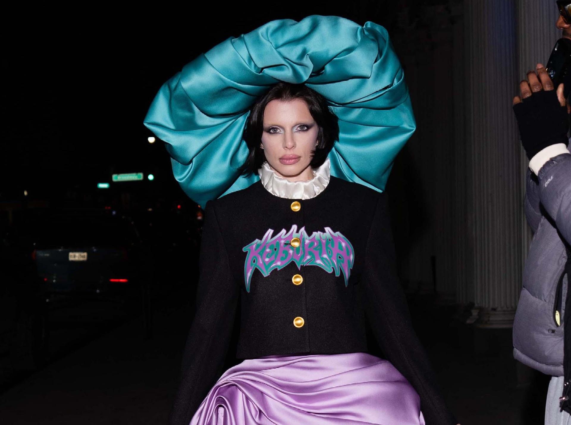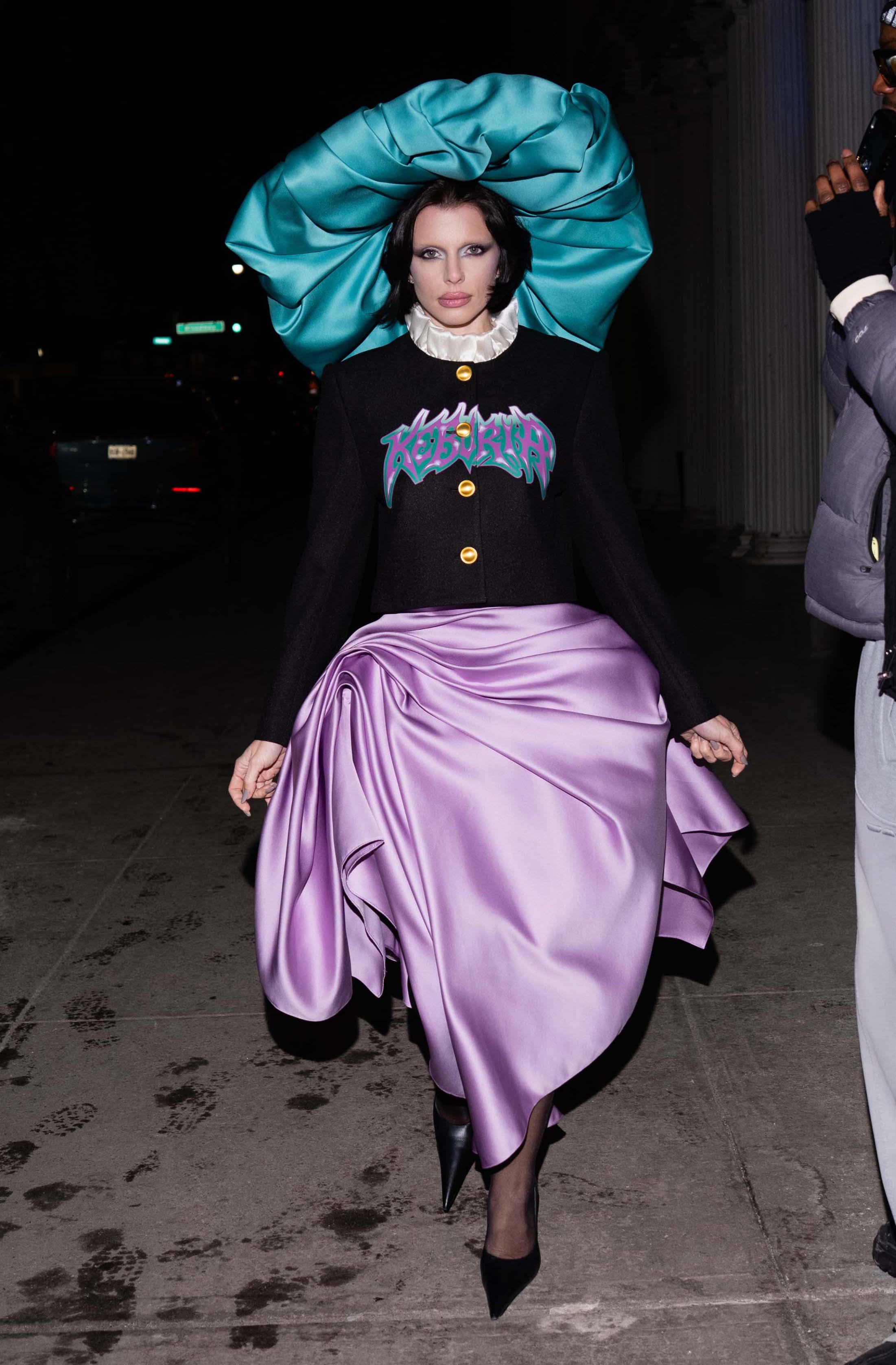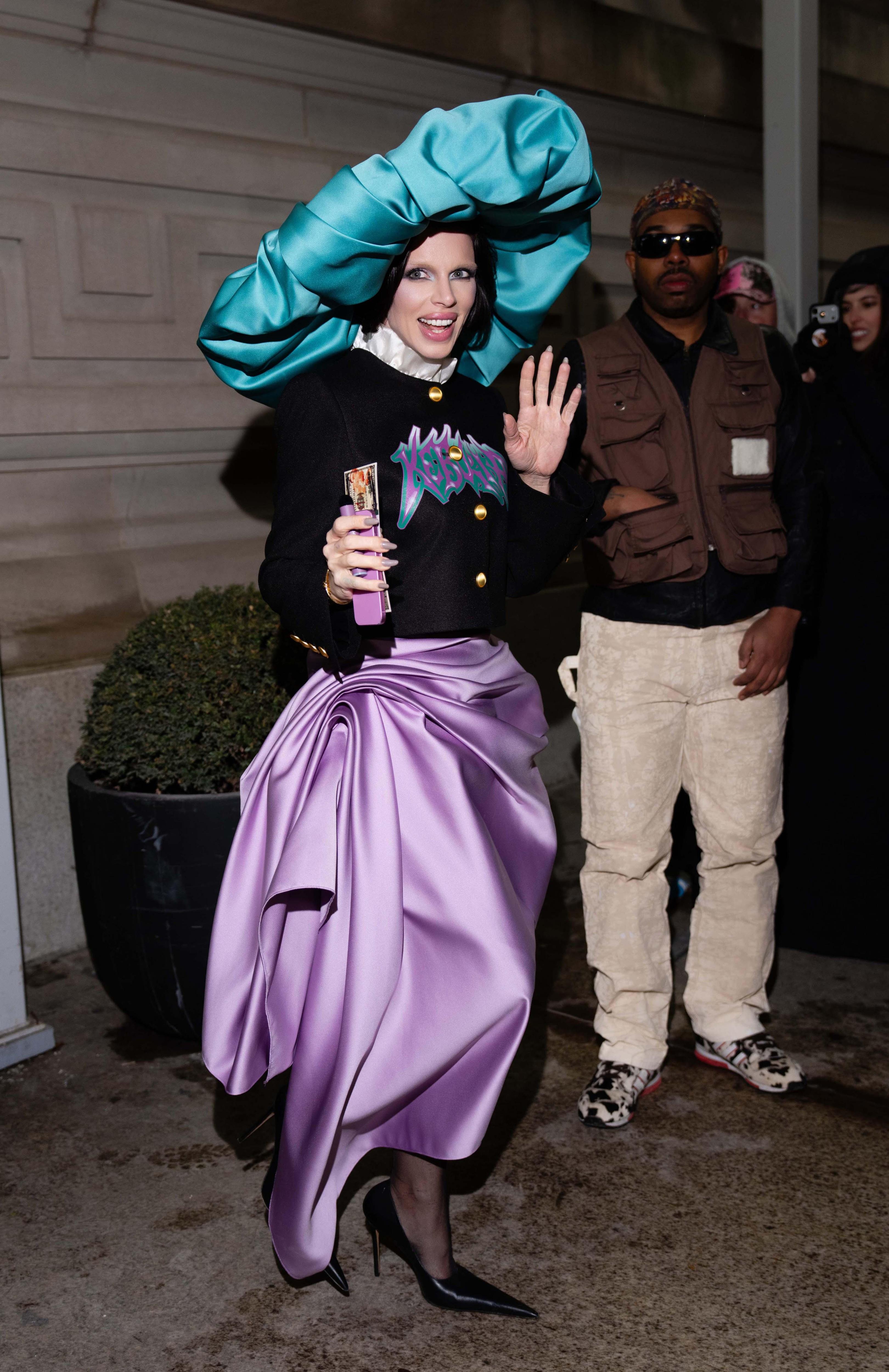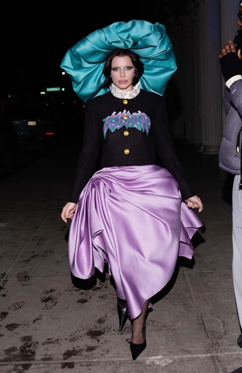 Джулия Фокс превращает выход на вечеринку в настоящий арт‑перформанс. Гигантский бирюзовый головной убор‑скульптура, жакет с неоновой надписью и драпированная лиловая юбка из сатина собираются в образ на грани кутюра, панка и ироничной эстетики — тот редкий случай, когда хочется рассматривать не только цвета, но и саму архитектуру одежды, придуманную будто для нишевой выставки нью-йоркского модного музея, а не для светского мероприятия.