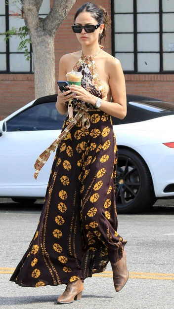 Обувь способна вывести наряд на совершенно другой уровень. Яркий тому пример — новый выход Эйсы Гонсалес. Актриса надела летящее платье макси с пестрым принтом, к которому вместо сандалий и босоножек подобрала сапоги в стиле вестерн. Наряд завершили солнцезащитные очки в прямоугольной пластиковой оправе.