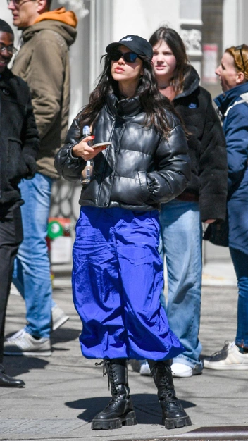 Этой весной предлагаем всем модницам, что любят аутфиты в спортивном стиле, повторить недавний выход мексиканской актрисы. Эйса Гонсалес появилась в черном укороченном пуховике и синих штанах-парашютах, которые она заправила в высокие массивные ботинки на шнуровке. Трендовый образ знаменитость дополнила кепкой, стильными очками и акцентной сумкой.