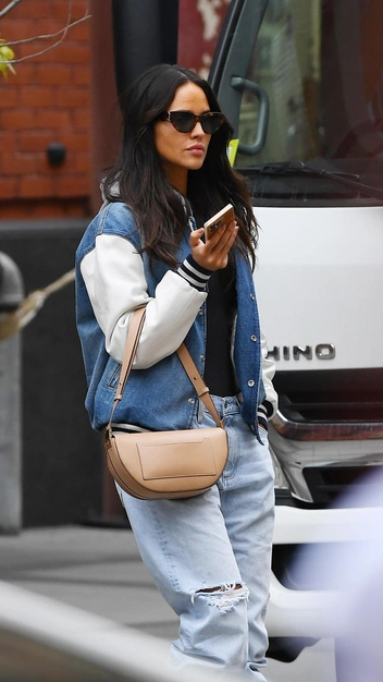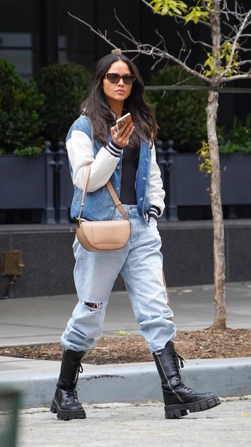 Эйса Гонсалес часто демонстрирует необычные стилевые приемы, и этот — один из них. Актриса появилась облегающем черном топе, поверх которого она надела бомбер со вставками из денима, и светло-голубых джинсах с рваными коленками. Штанины знаменитость заправила в высокие грубые ботинки на шнуровке — такой прием используют самые смелые и модные девушки. Завершила она выход бежевой фактурной сумкой и стильными солнцезащитными очками.