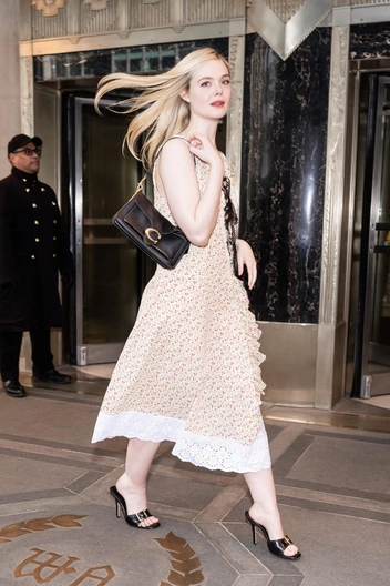 Легкое платье в мелкий цветочный принт с воланами и расшитым подолом превращает Эль Фаннинг в героиню современного ромкома: силуэт миди подчеркивает природную нежность актрисы, но также остается практичным для длительных городских прогулок. Черная сумка через плечо и лаковые мюли с золотистой пряжкой добавляют взрослой структурности, так что ее сказочность не инфантильная, а ироничная — как будто фея решила на день выйти из леса и побродить по улицам Нью-Йорка.