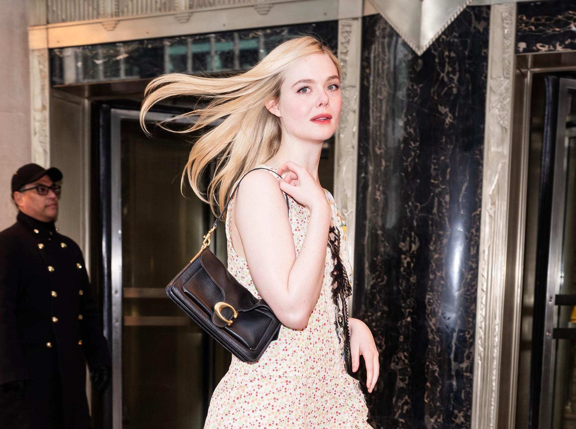 Легкое платье в мелкий цветочный принт с воланами и расшитым подолом превращает Эль Фаннинг в героиню современного ромкома: силуэт миди подчеркивает природную нежность актрисы, но также остается практичным для длительных городских прогулок. Черная сумка через плечо и лаковые мюли с золотистой пряжкой добавляют взрослой структурности, так что ее сказочность не инфантильная, а ироничная — как будто фея решила на день выйти из леса и побродить по улицам Нью-Йорка.