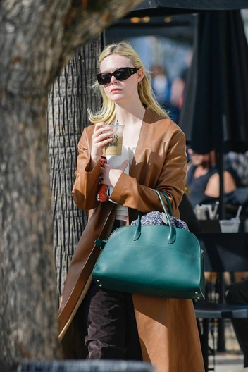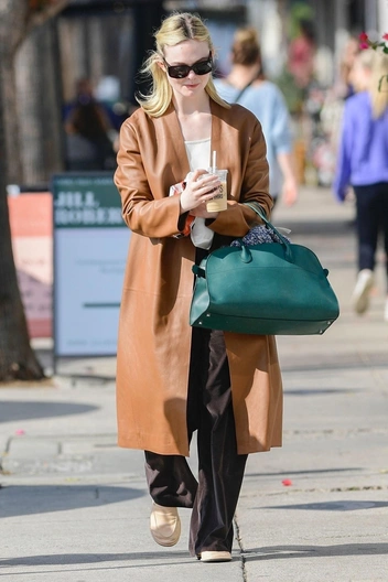 Мы чаще видим Эль Фаннинг на красных дорожках, чем во время прогулки по городу — но актриса умеет выглядеть эффектно в любой ситуации. На этот раз Эль вышла в вельветовых брюках темно-коричневого цвета, которые сочетала с кожаным тренчем и бежевыми лоферами. Но главным акцентом образа стала сумка яркого бирюзового оттенка, которая сочеталась с остальным образом актрисы.