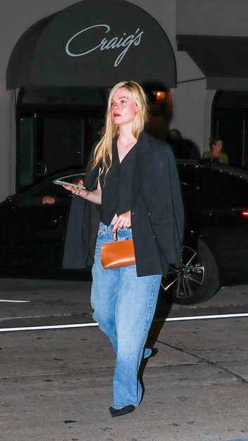 Эль Фаннинг провела вечер в компании подруг. Девушки отправились на ужин в стильных вечерних образах. Актриса примерила костюмный укороченный жилет вместе с широкими голубыми джинсами на низкой посадке, дополнив выход свободным пиджаком. Завершила наряд она остроносыми туфлями, лаконичной коричневой сумкой и красной помадой.