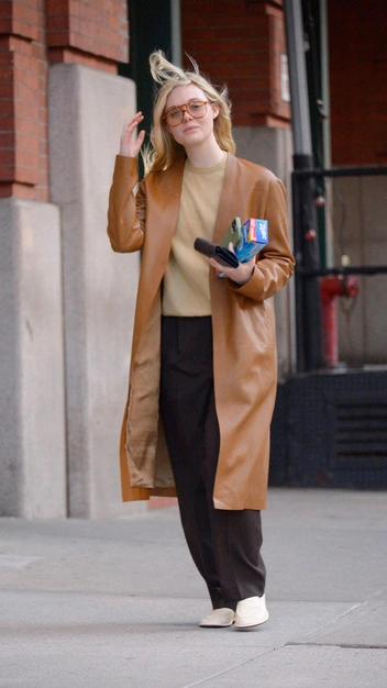 Эль Фаннинг показала, как стильно может выглядеть самый простой образ. Звезда надела объемный пуловер в бежевом оттенке и подобрала к нему темно-коричневые широкие брюки с защипами. Изюминкой стал кожаный плащ, который гармонично дополнил выход цветовой палитрой. Идеально вписались сюда и молочные туфли-тапочки, и солнцезащитные очки с цветными стеклами в винтажном стиле.