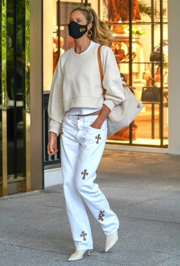 Вечное лето — заветная мечта многих из нас. К сожалению, в российских широтах выгуливать традиционную для теплого сезона колор-палитру едва ли возможно в осенние и зимние месяцы, но жители Лос-Анджелеса могут спокойно позволить себе такую опцию. Под занавес осени австралийская модель Эль Макферсон дефилирует по городским улицам в стильном образе в total-white. Легенда подиумов останавливает свой выбор на сочетании белых джинсов, базовой майки, пуловера в оттенке крем-брюле и обуви на каблуке. Образ звезды завершают черная защитная маска и сумка в тон пуловера.
