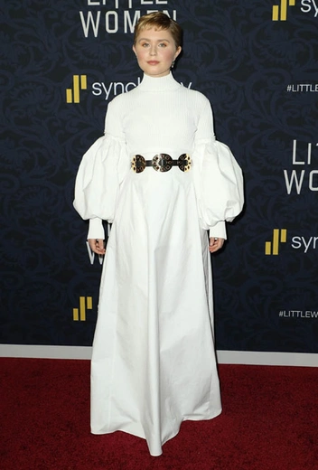 20-летней актрисе Элайзе Скален пророчат большое будущее в кино. За ее плечами – роль в сериале «Острые предметы», драме «Молочные зубы», представленной на Венецианском кинофестивале осенью, а теперь фильмография актрисы пополнилась ролью в ленте «Маленькие женщины», где ей довелось сыграть вместе с Мерил Стрип, Лорой Дерн, Сиршей Ронан и Эммой Уотсон. На ковровой дорожке нью-йоркской премьеры молодой актрисе также удалось запомниться – она выбрала безупречное платье Khaite молочного оттенка, дополненное крупным золотым ремнем с пластинами и алыми камнями.