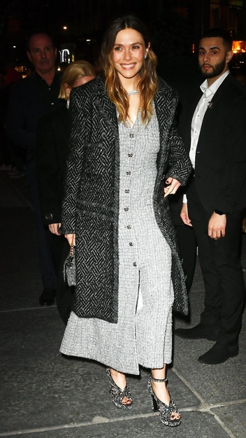 Рассматриваем новый безупречный выход Элизабет Олсен и запоминаем идею для вечернего образа. Знаменитость отправилась на мероприятие в лаконичном наряде: она выбрала макси-платье в сером цвете из твида с декоративными карманами, пуговичным рядом и высоким разрезом. Поверх него американская актриса надела темное пальто прямого кроя и застилизовала наряд блестящими туфлями в духе нулевых. За сияние в образе также отвечают сумка и украшения.