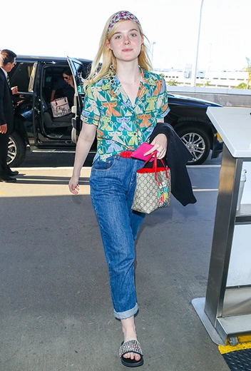20 апреля в аэропорту Лос-Анджелеса была замечена Эль Фаннинг. Для перелета юная актриса выбрала расслабленный наряд из рубашки с коротким рукавом и пары mom's jeans, дополнили который шлепанцы в стразах и сумка от Gucci. Эль, как видно по фото, отказалась от макияжа. Своим примером актриса доказывает, что главное украшение молодой девушки – хорошее настроение и искренняя улыбка, а не тонна косметики на лице.