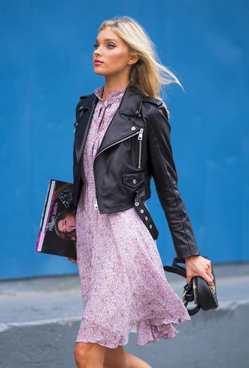 Если не знаете, с чем надеть легкое платье десертного оттенка в прохладный летний день — берите косуху. Как, например, это сделала Эльза Хоск: топ-модель и ангел Victoria's Secret ровно в таком наряде и появилась на улицах Нью-Йорка 13 июня. В качестве аксессуаров — розовые лоферы и черная поясная сумка от Gucci — стопроцентный хит всех стрит-стайл отчетов.