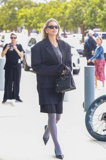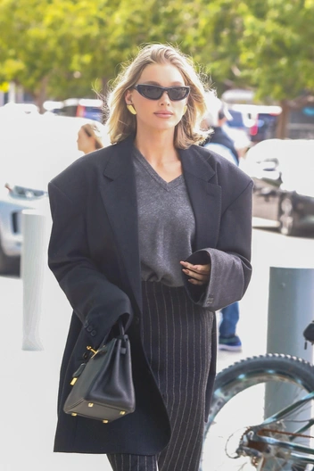 Если вы не знаете, что накинуть поверх нарядного или делового наряда — обратите внимание на аутфит Эльзы Хоск. Звезда предлагает примерить оверсайз пиджак с подкладными плечами удлиненного кроя. Топ-модель дополнила им вещи в стиле 80-х: юбку-карандаш и джемпер с остроносыми туфлями на небольшом каблуке. Из аксессуаров Хоск приглянулась сумка Hermes и солнцезащитные очки.