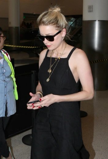 Очередной аутфит в черной палитре, заготовленный актрисой для перелета, получился довольно интересным благодаря аксессуарам. Перед папарацци в аэропорту Лос-Анджелеса Эмбер Херд появилась в черном платье Alpha 60 и ботинках в ковбойском стиле Grand Prix Paddock Boots. Завершающие штрихи – цепочка с подвесками от Lucy Williams, браслеты Missoma Interstellar и Tiffany & Co., а также очки Saint Laurent.