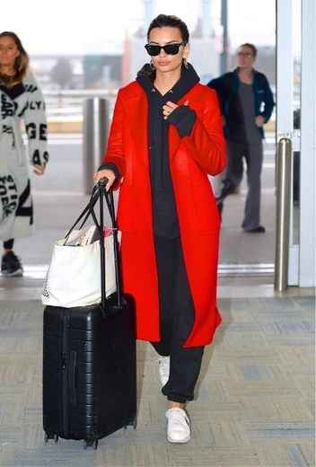 Теплый сезон уже не за горами, а в Нью-Йорке знаменитости уже давно начали перестраиваться с эко-шуб и утепленных моделей одежды на по-весеннему яркие аутфиты. Эмили Ратажковски напоминает нам про универсальное сочетание спортивного и классического стилей, которое можно пробовать как для прогулок по городу, так и для встреч с подругами. Красный тренч она сочетает с полуспортивным костюмом в темном оттенке, дополняя расслабленный фэшн-лук белыми кроссовками и черными очками.