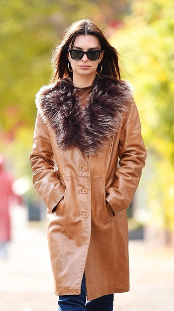 Эмили Ратаковски продолжает вдохновлять нас на модные эксперименты. Например, на этот раз она надела полупрозрачный коричневый топ и синие узкие джинсы, показав стильное цветовое сочетание. В качестве верхней одежды знаменитость выбрала кожаный плащ с меховой отделкой в винтажном стиле. Завершила она лаконичный образ классическими солнцезащитными очками, акцентными пятнистыми сапогами и крупными серьгами-кольцами.