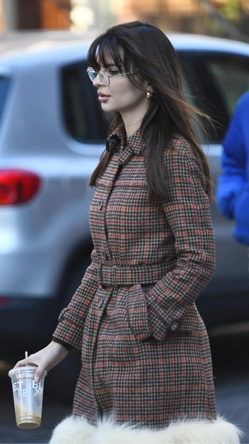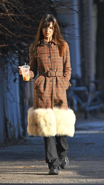 Продолжаем восхищаться коллекций верхней одежды у Эмили Ратаковски. На этот раз селебрити появилась в клетчатом пальто, напоминающем по крою тренч, подол которого декорирован акцентной меховой отделкой в кремовом оттенке. На низ она надела длинные прямые брюки и спортивные кроссовки в черном цвете. Эффектности и небанальности образу придали круглые очки с прозрачными стеклами.