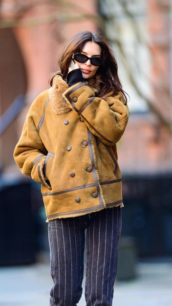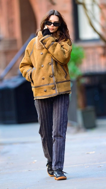 В морозы дубленка становится нашим спасением, но как ее носить в городе и с чем стилизовать, чтобы не выглядеть нелепо? Эмили Ратаковски показывает модный выход, который нам не терпится повторить. Звезда в дополнение к горчичной дубленке подобрала прямые синие джинсы в светлую полоску и дополнила повседневный аутфит замшевыми кроссовками в винтажном стиле. Шика образу придали ультрамодные солнцезащитные очки узкой формы.