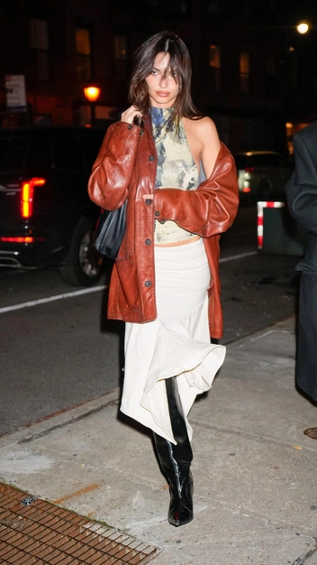 Эмили Ратаковски вновь поражает поклонников необычным образом и демонстрирует ультрамодное сочетание кожи и шелка. Удлиненную куртку оранжевого цвета она застилизовала с нежным весенним нарядом, состоящим из трендовой белой юбки миди и принтованного топа. Знаменитость умело играет с текстурами и материалами, что делает аутфит стильным и динамичным. Черные лаковые сапоги-трубы и кожаная сумка завершили трендовый лук.
