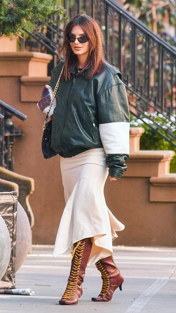 Эмили Ратаковски дразнит нас весенними образами, которые мы берем на заметку уже сейчас. Ее новый аутфит снова отражает винтажную эстетику. Например, на этот раз она примерила черный лонгслив в сочетании с необычной асимметричной юбкой в молочном оттенке. В качестве верхней одежде звезда выбрала модный бомбер из кожи и сделала ставку в образе на эффектные сапоги с квадратным мысом и акцентной желтой шнуровкой.