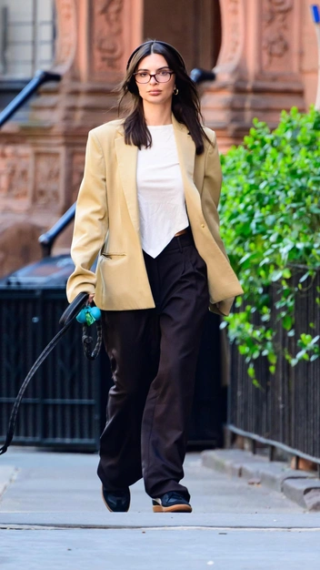 Многие женщины до сих пор считают, что пиджаки — предмет делового гардероба. Однако современные модницы давно доказали обратное и показали, как носить пиджаки в любых ситуациях. Эмили Ратаковски предлагает комбинировать пиджак с акцентными плечами в желтом оттенке с расслабленной белой футболкой и широкими черными штанами в спортивном стиле. К модному аутфиту она подобрала винтажные кеды в синем цвете и трендовые очки с прозрачными стеклами.