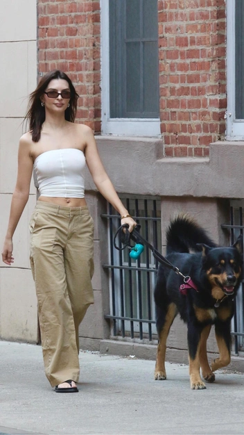 Ищите стильные брюки на теплую погоду? Эмили Ратаковски нашла трендовый вариант, который будет актуален весной и летом. Топ-модель отдала предпочтение базовым бежевым брюкам прямого кроя на низкой посадке. У нее они выполнены без дополнительного декора, но они также могут содержать накладные карманы и резинку снизу. К брюкам звезда подобрала белый топ-бандо, сабо и узкие очки.