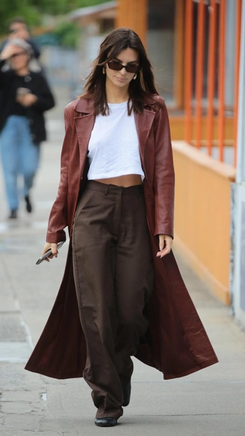Мы привыкли к тому, что кожаный плащ ассоциируется у нас с дерзостью и эффектностью, однако Эмили Ратаковски доказала, что в нем можно выглядеть утонченно и женственно. Звезда появилась в базовой кроп-футболке и подобрала к ней классические брюки на высокой посадке с защипами. Поверх она надела стильный плащ из матовой кожи и завершили образ трендовыми сапогами с квадратным мысом, очками и крупными серьгами.